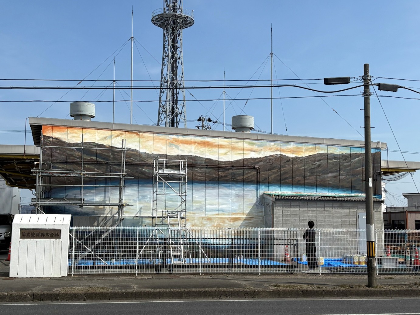 只今、当社石巻営業所の社屋壁画に、高さ5.5m×幅16mの「ペイントアート」が進行中です。